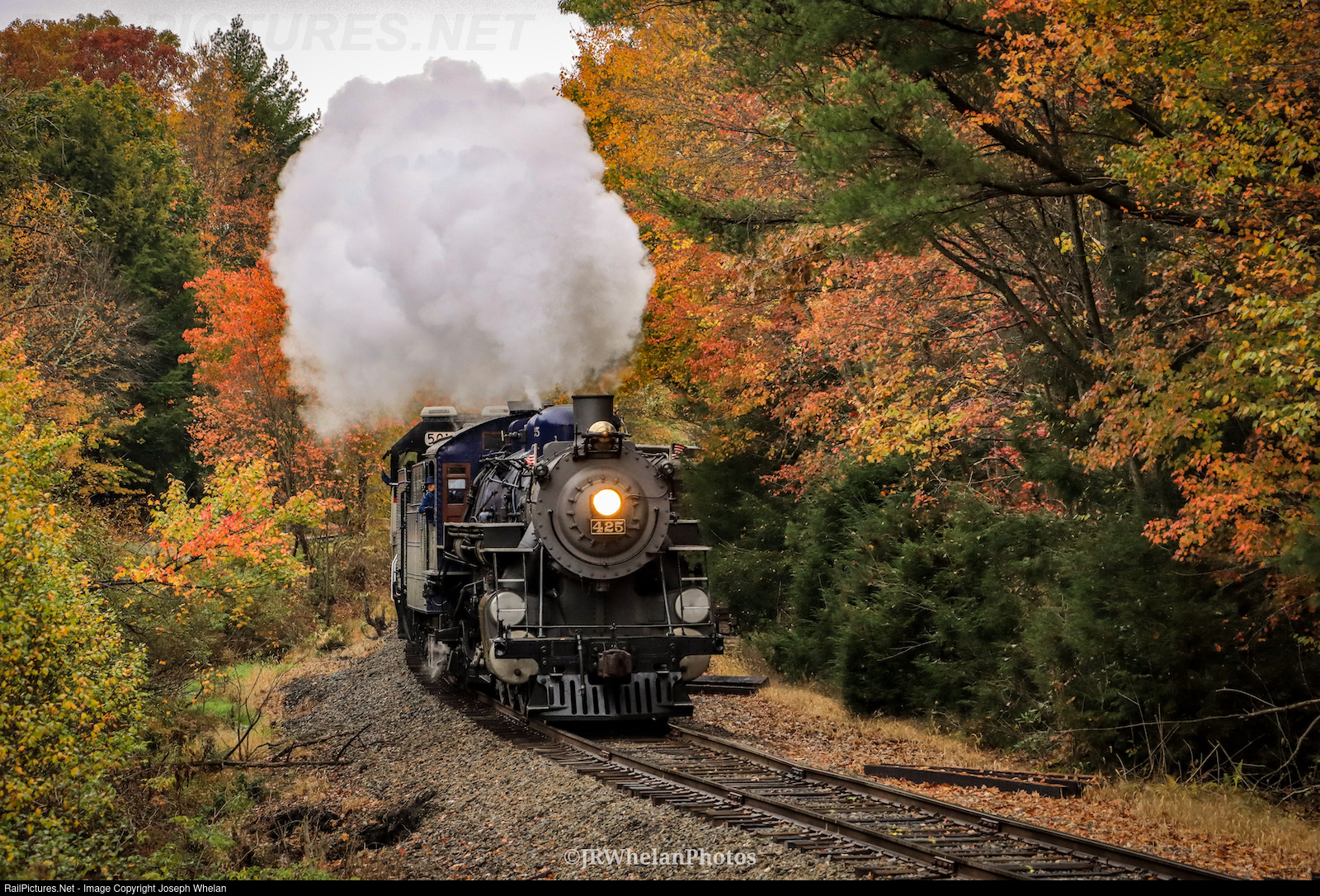 As the foliage reaches its peak, Reading & Northern 425 rolls downhill through a popular spot West of Nesquehoning.