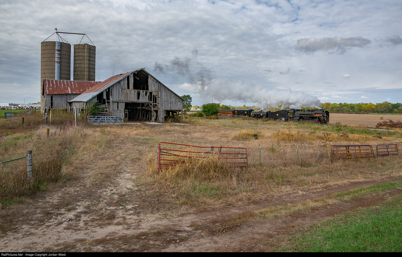 After dropping off the majority of the train in the siding, 6988 heads east to wye in South Amana, past an old decrepit barn.