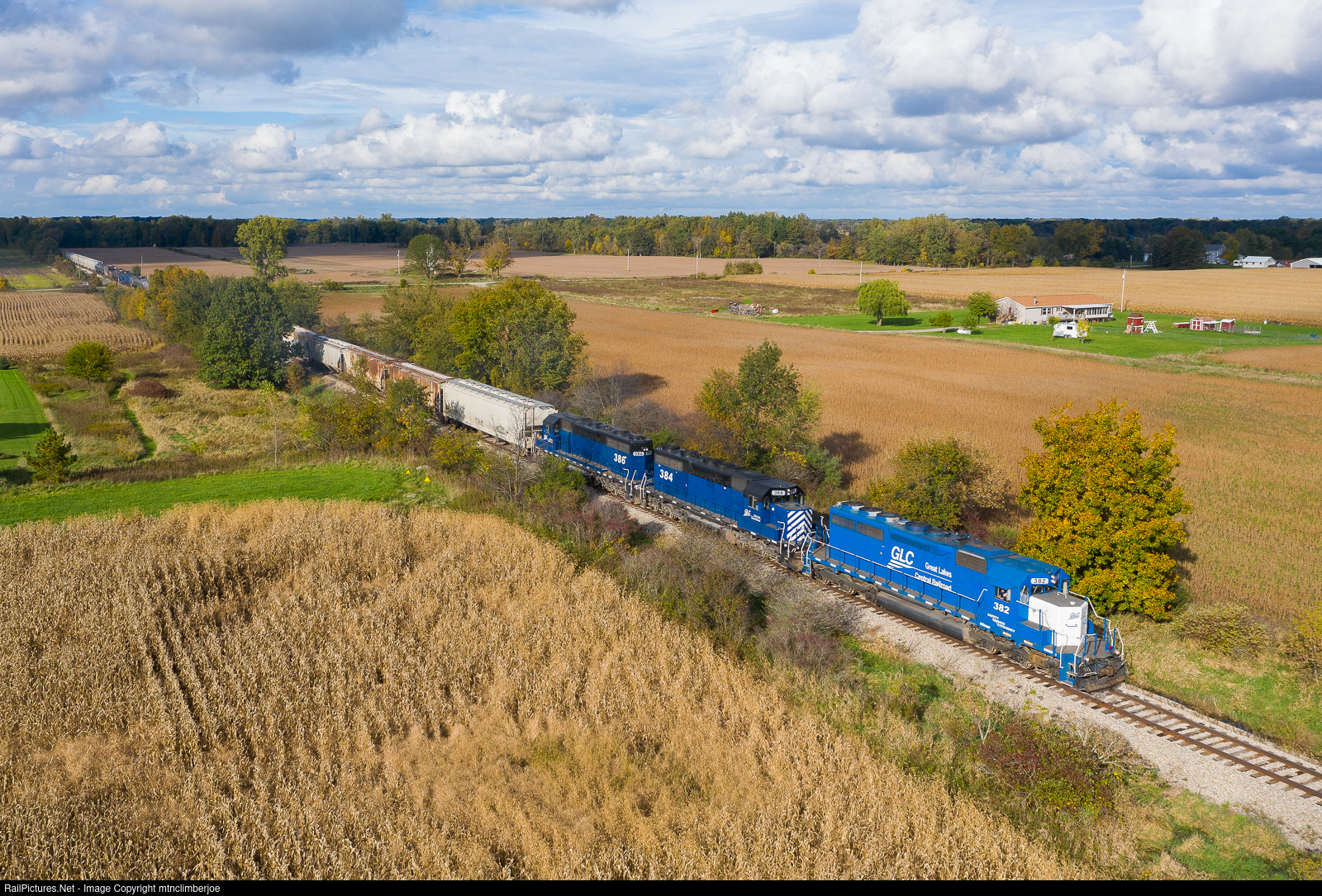 | The Great Lakes Central's OSTN accelerates southbound after coming off a brief section of trackage rights over the CN in Durand, Michigan and on to their Ann Arbor District, rolling through the rural landscape as the sun comes out from behind the clouds. |
