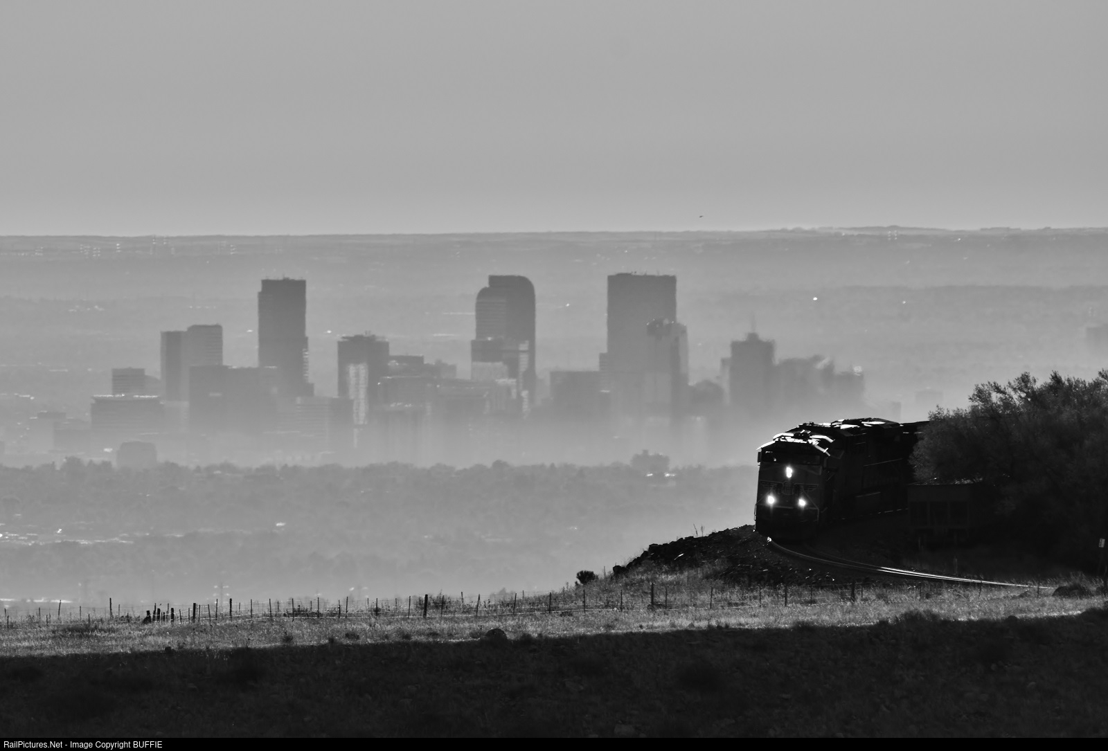 UP 7765 (ES44AC) rounds the Big Ten Curve as the City of Denver skyline simmers in the background.