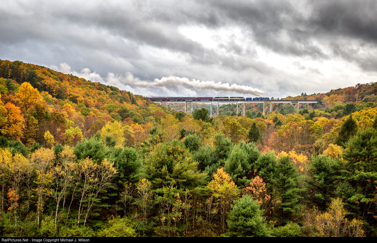 Silence in the colorful fall valley beneath the Hometown High Bridge outside of Hometown, PA on October 23, 2021 is broken by hustle of Reading & Northern #425 as she heads south on former Central Railway of New Jersey trackage leading one of the Reading & Northern's annual fall foliage excursions.