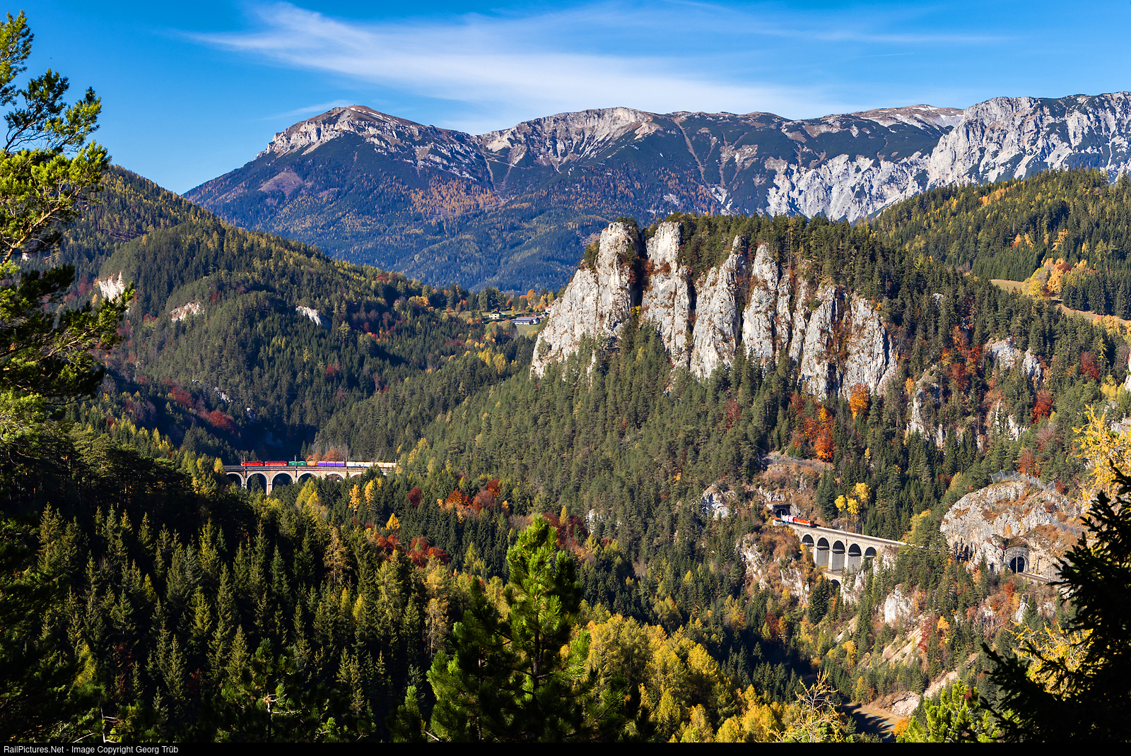 A freight train of the ÖBB (Austrian State Raiways) is running up the north ramp of the Semmering pass line, UNESCO World Heritage since 1998, with two locomotives 1144 in front on the Kalte Rinne viaduct, and a pusher locomotive 1144 in the rear, visible on the Krauselklause viaduct. In the background the Polleros rock wall and the Rax mountain range with the Heukuppe (2007 meter a.s.l.) on the left.