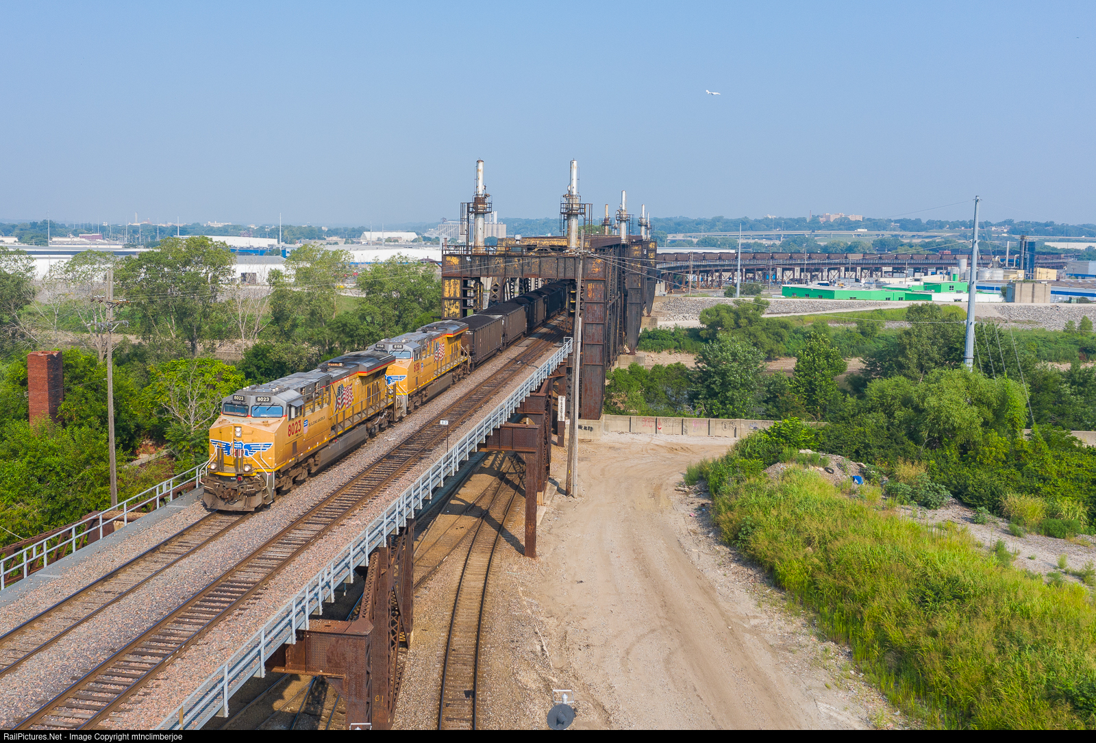| A pair of ES44's lead a loaded Union Pacific coal train as it crosses over the Kansas River on the KCT's High Line bridge in Kansas City, Kansas. The train will roll then roll through the middle level of Santa Fe Junction. |