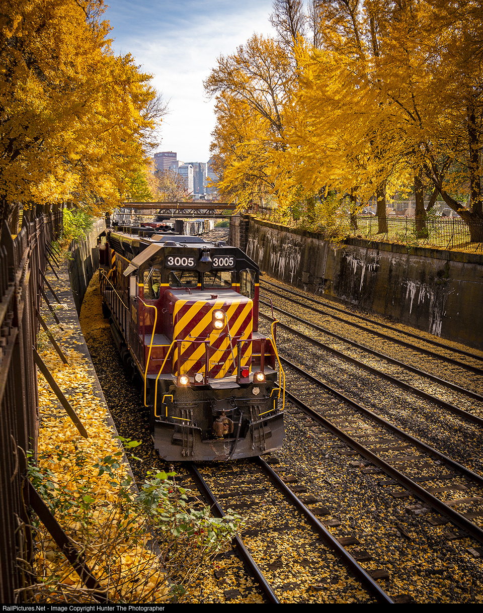 | The daily Allegheny Valley Railroad train rolls through the trench in West Park as it approaches Island Ave. Yard where it will interchange with Norfolk Southern on a partly cloudy November 14, 2020. |