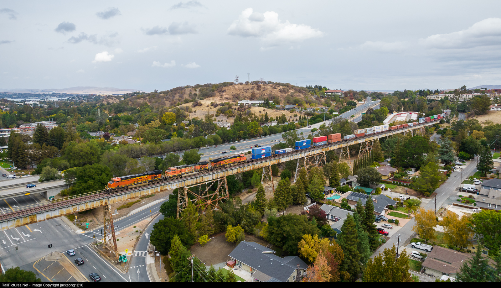 | A westbound BNSF intermodal train powered by a trio of GE's crosses over the 1,660 ft Muir Trestle over the town of Martinez on its way to the Oakland intermodal terminal. |