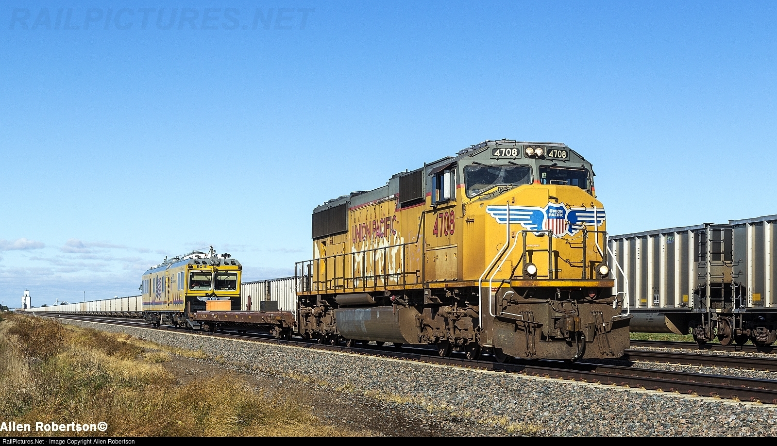UP 4708 is eastbound with track evaluation car EC-5 in tow.