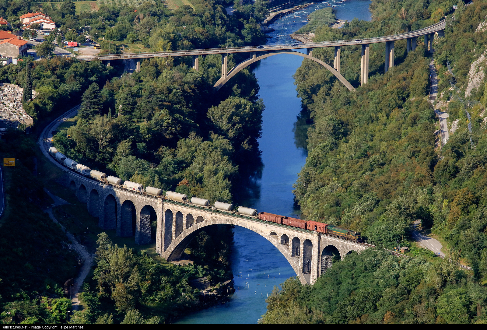 Mixed freight train cross over Isozno river coming from Nova Gorica.