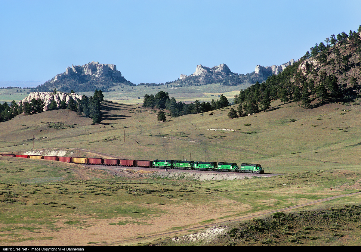 Slowly climbing over Nebraska’s Pine Ridge, a Burlington Northern coal train grinds upgrade on Crawford Hill between Crawford and Belmont, Nebraska, on the afternoon of July 2, 1989. Up front, the train is led by a pair of EMD SD40-2s, a pair of GE C30-7s and a GE U30C.