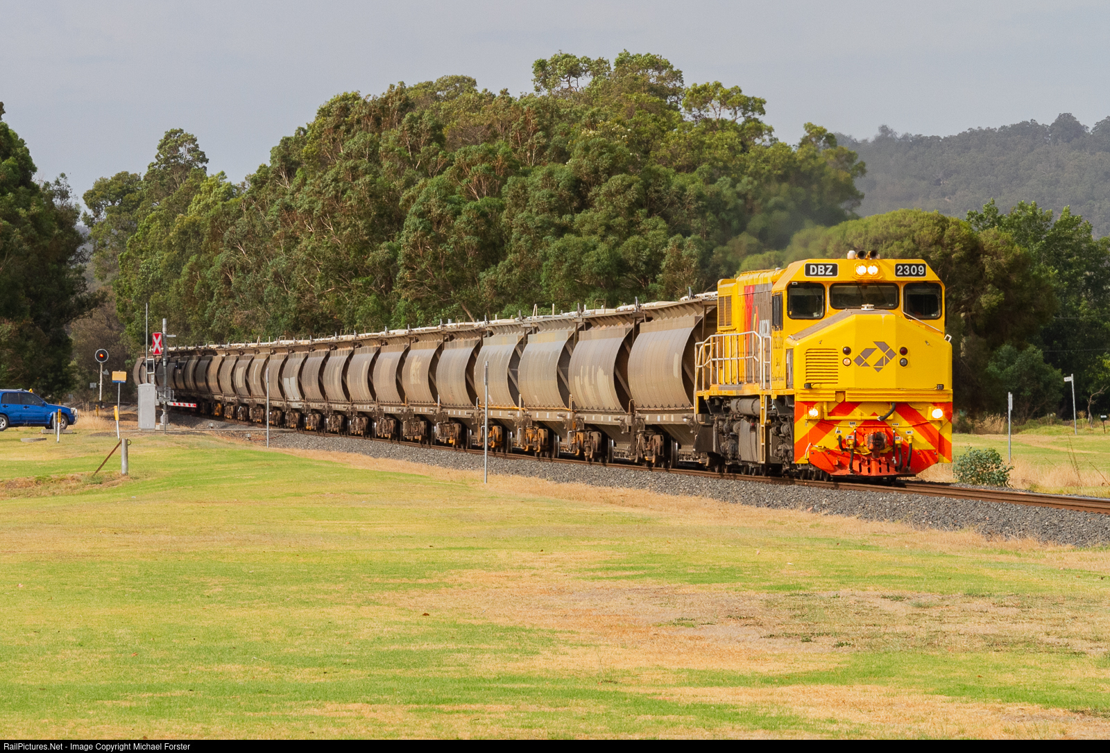 DBZ2309 works a loaded alumina train through Harvey in Western Australia's picturesque southwest division.