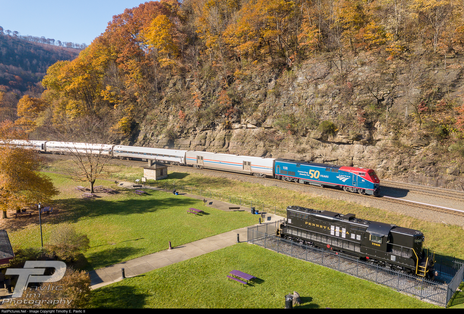 With the last vestiges of fall color clinging to the trees, Amtrak's daily Pennsylvanian makes its decent around the World Famous Horseshoe Curve. #108 has been the regular power this week, allowing for some colorful images with Pennsylvania Railroad EFS-17M (aka GP9) #7048 in the low morning sun.