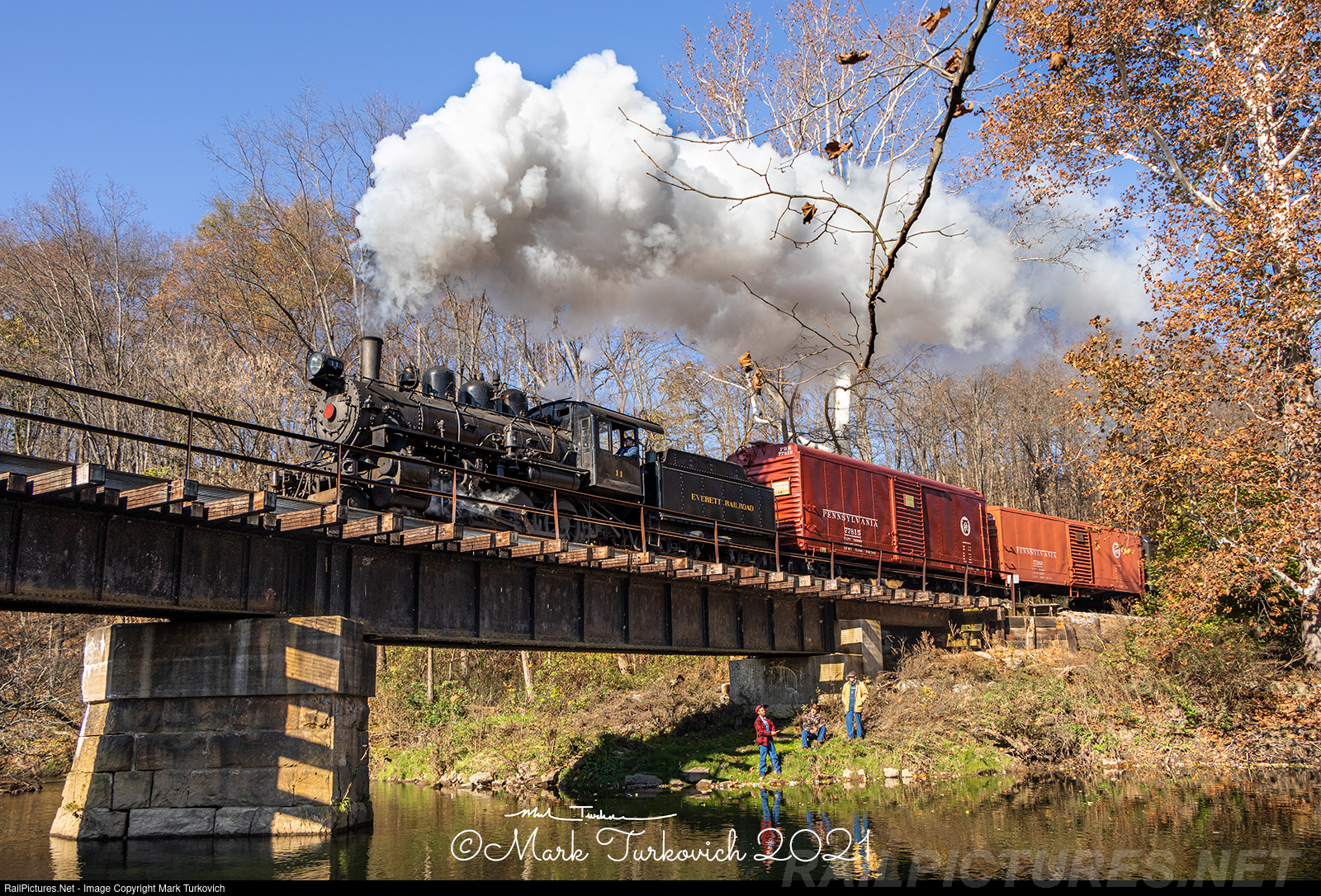 Everett Railroad 11 passes by a group of fisherman as it crosses the Little Juniata River.