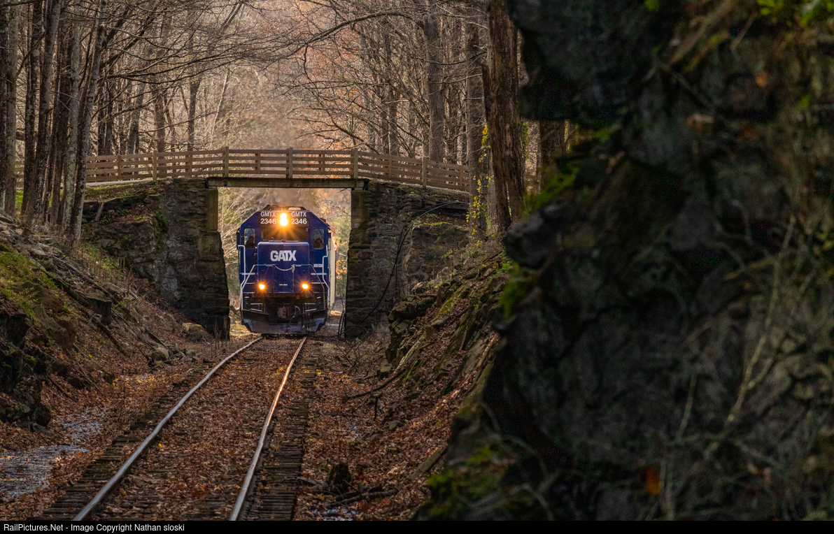 Homeward Bound : Housatonic Railroad's NX12 passes under the old Trinity single lane bridge as they return north back to Canaan, CT. After the bridge, NX12 will pass through a tight rock cut before entering the little town of Covered Bridge in West Cornwall.