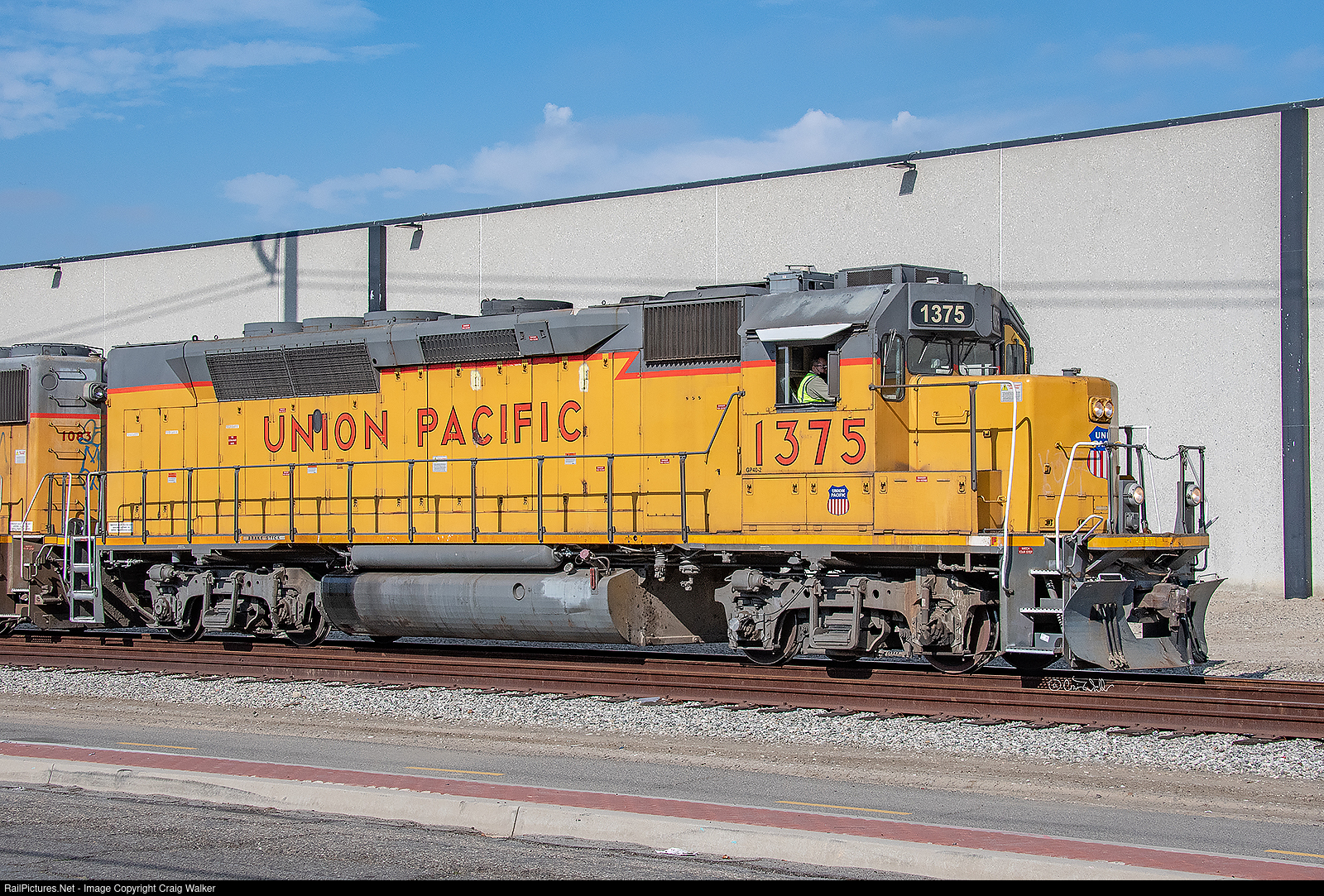 General Motors Electro-Motive Division constructed only three GP40P-2 locomotives, all for the Southern Pacific (SP 3197-3199) for use on their commuter trains on the San Francisco Peninsula. Two of them ended up on the Union Pacific through the UP-SP merger (UP 1373 and 1375), with the third having been sold to the Indiana Harbor Belt – all three had their steam generators removed decades ago. Forty-seven years after it was built, UP GP40P-2 (classed as just a GP40-2 on the UP) 1375 ended up in local service on trains originating out of the West Anaheim Yard. UP 1375 is the former SP 7602, originally SP 3199. (Santa Ana, California – November 17, 2021)