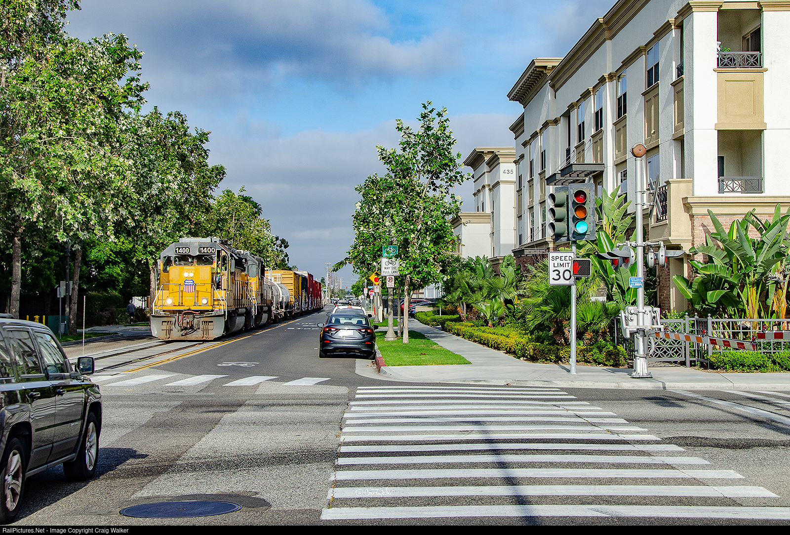 Union Pacific train LOA32 (the "Marlboro") heads east down Santa Ana Street in Anaheim, approaching the Anaheim Boulevard intersection. This was the location, on the right, of the Southern Pacific's Anaheim Station many years ago. UP GP40-2 1400 (ex-Cotton Belt 7645) and GP60 1064 (the former UP 1909, originally Southern Pacific 9607) are hauling this local eastward down Santa Ana Street and will shortly "hang a right" and head south on Olive Street before hopping on Metrolink’s Orange Sub to get to Santa Ana, at which point this train will divert back onto the UP’s Santa Ana Industrial Lead to serve some industries. (Anaheim, California – June 15, 2020)