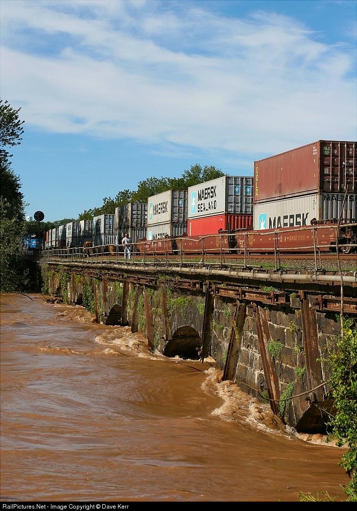 With his train behind him, and westbound 23Z passing on his left, the conductor of NS 650 inspects the PRR stone bridge over Sherman's Creek, its muddy waters swirling beneath him. Canon 20D and 17-40 mm lens, 1/400 second exp., f8.0, F.L. 40mm, ISO 100.