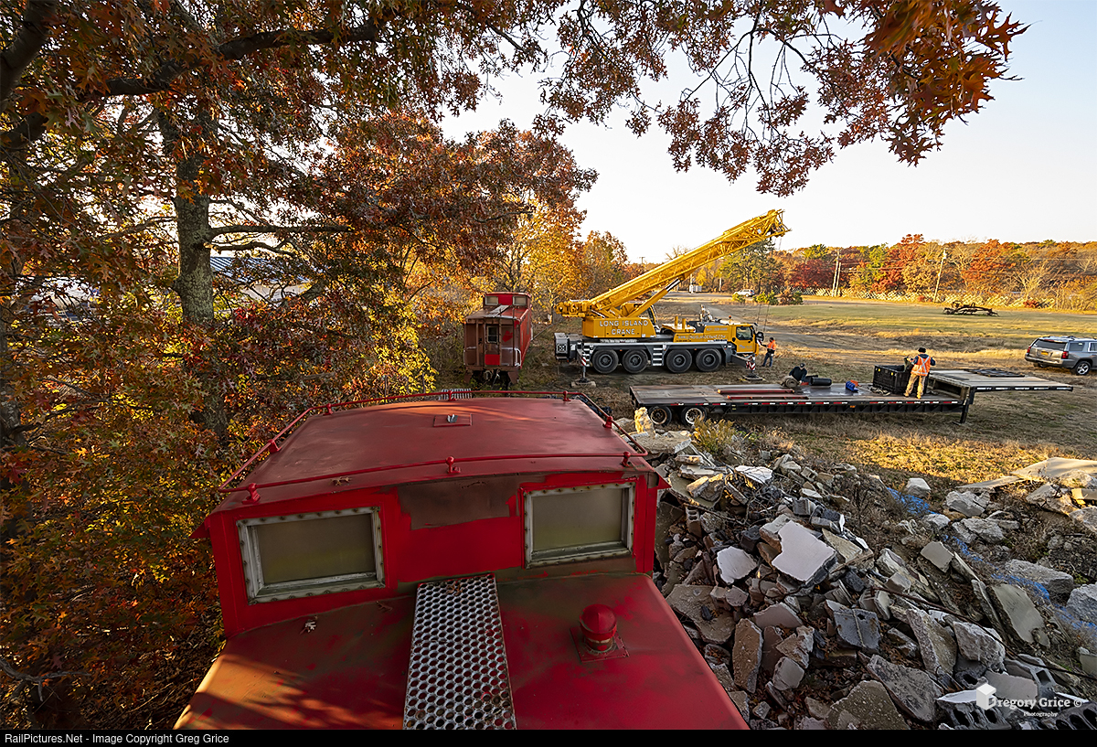 Ex-Missouri Pacific Railroad cabooses 13456 & 13388 sit ready for removal from the old Kroemer Siding, just off of Long Island Rail Road's Main Line in Riverhead, NY on the morning of November 18th, 2021. Both cabooses and an ex-P&LE boxcar were moved from this location to the NRHS Twin Forks Chapter's property, just 2.5 miles away across from the Riverhead train station. From the top of 13388, Long Island Crane & Rigging crews are seen prepping one of their Liebherr LTM 1090-4.1 mobile cranes for it's first task of lifting 13456 off of it's trucks.