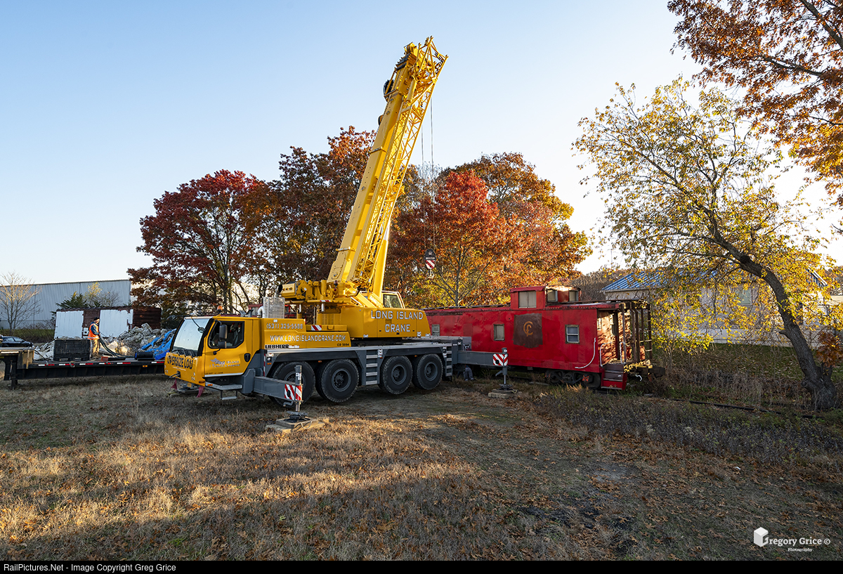 On the morning of November 18th, 2021, ex-Missouri Pacific Railroad caboose 13456 awaits a lift while Long Island Crane & Rigging crews prep one of their Liebherr LTM 1090-4.1 mobile cranes at the old Kroemer Siding in Riverhead, NY.