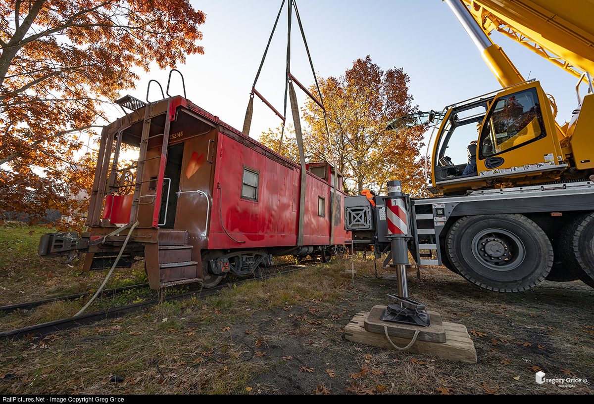 On the morning of November 18th, 2021, a Long Island Crane & Rigging crane operator begins to lift ex-Missouri Pacific caboose 13456 from its trucks at the old Kroemer Siding in Riverhead, NY.