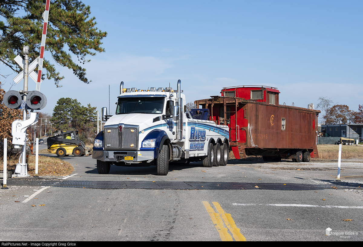 On the morning of November 18th, 2021, ex-Missouri Pacific caboose 13456 prepares to cross the Long Island Rail Road Main Line on a tow truck at Kroemer Avenue while beginning a short trip to a new home in Riverhead, NY.