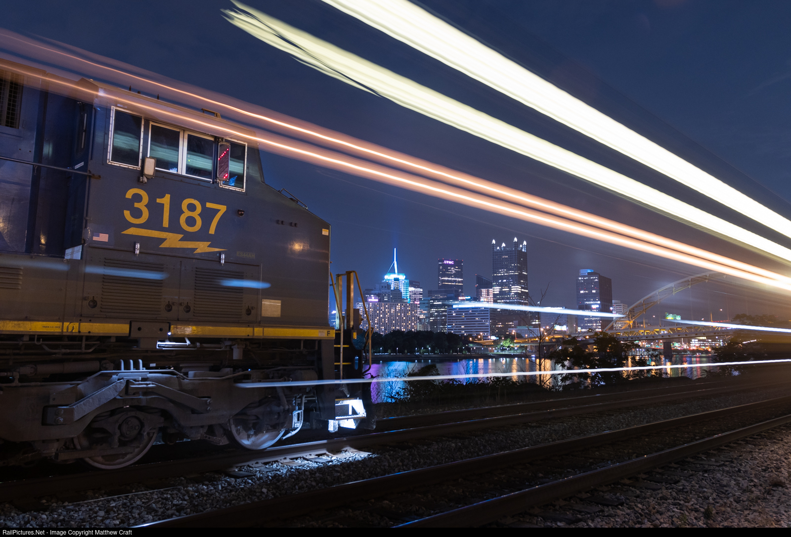 | CSX 3187 idles on a humid July evening in Pittsburgh as a westbound intermodal roars by. The ES44AC is at the head of an eastbound coal train, and had to sit and wait for 3 westbound trains before they were able to get moving again. |