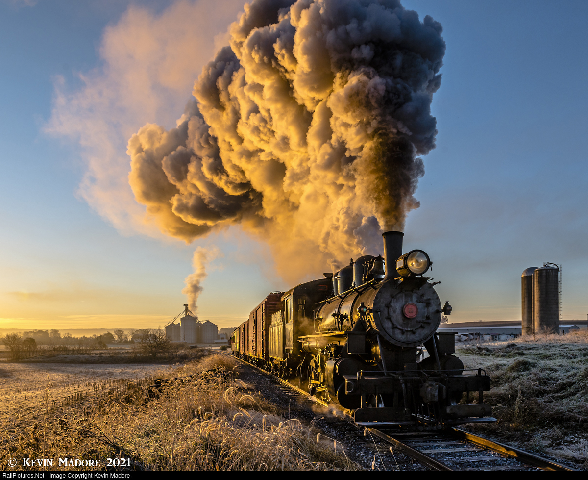 In this sunrise image, the now Everett Railroad #11 makes a spirited run-by with a mixed train for a Historic Transport Preservation Charter in November of 2021. She is pictured northbound at the Renaissance Nutrition Complex near Martinsburg, PA, at about Milepost 20.