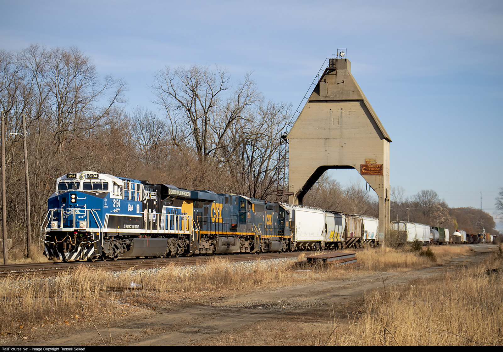 | CSXT 3194 the "Spirit of Law Enforcement" unit leads Q327 under the old Coaling Tower in New Buffalo. This location was once a larger yard for the Pere Marquette Railway. It included a smaller roundhouse and engine facility. |