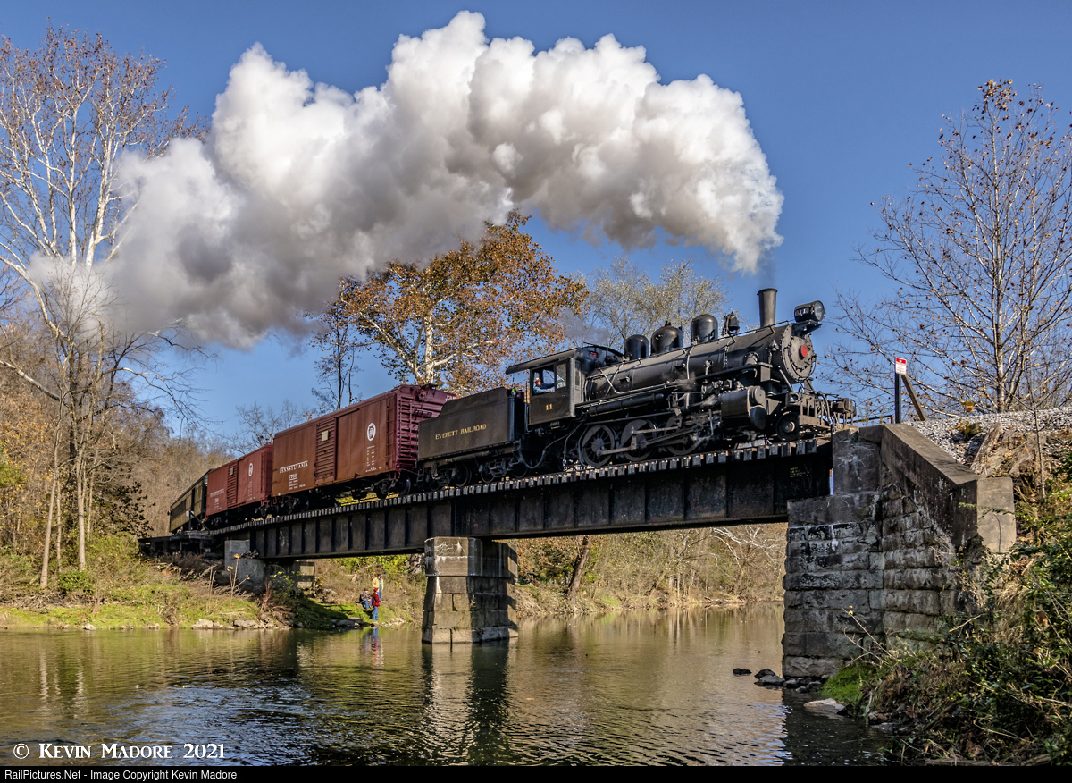 Steam scenes from Pennsylvania's Everett Railroad, featuring the former Bath & Hammondsport 2-6-0 #11, operating on photo charters and local Christmas Trains.