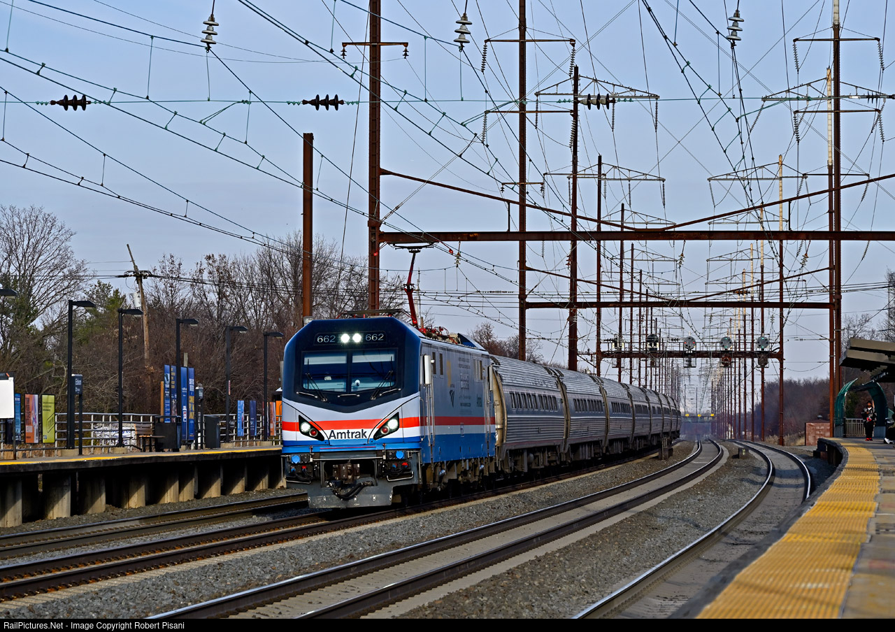 | Amtrak 662 races through Edison on its second trip after being wrapped in "Phase III" paint. The wrap is sponsored by Dovetail Games and advertises their Train Sim World 2 software. Based upon online evidence, it seems this locomotive was photographed at least once every few miles on its journey from Boston to Washington. |