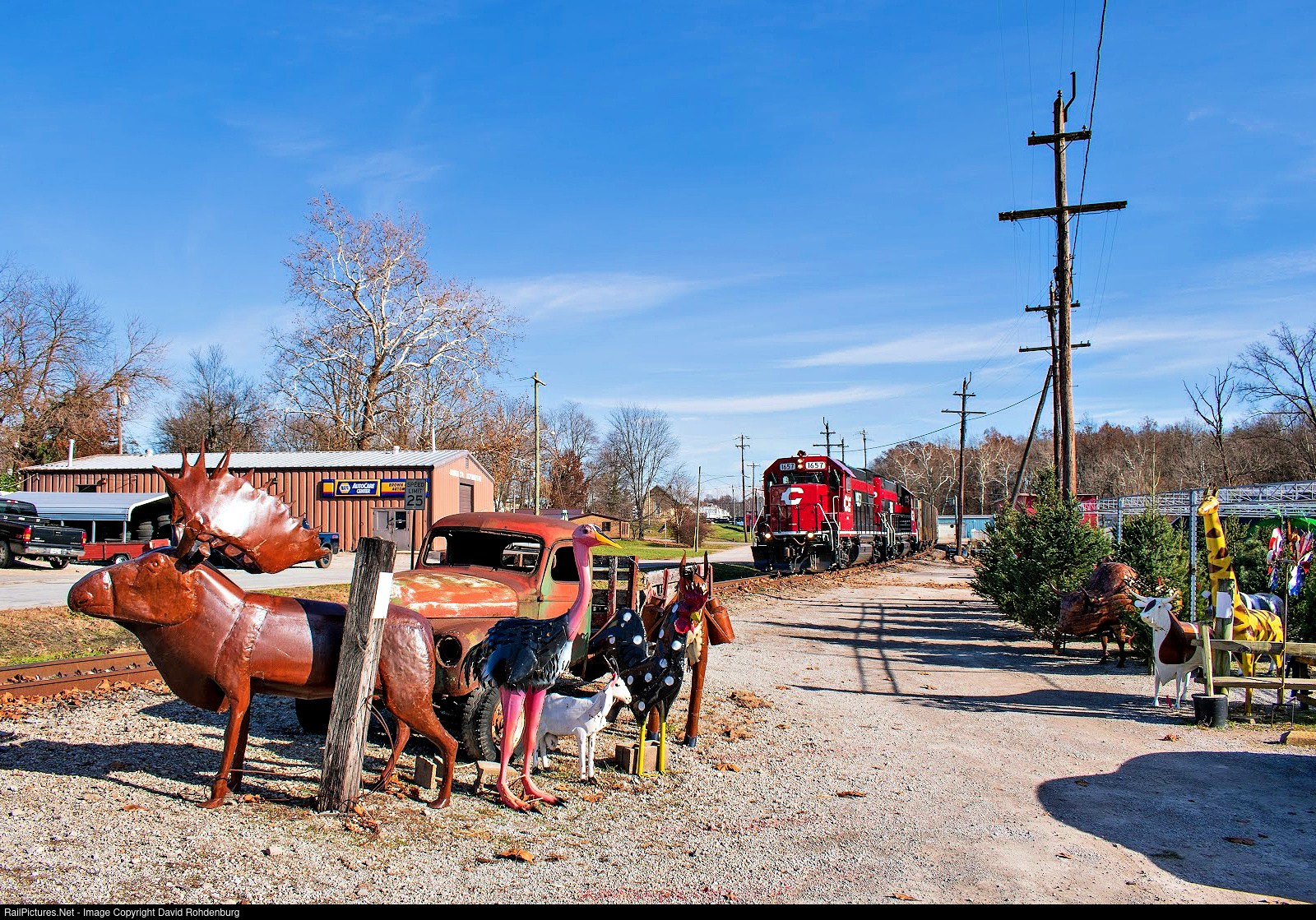 Small Town USA...Some yard decorations and an old pickup truck owned by the Ole Mill Store are setup trackside in Mt. Orab, Ohio as a Cincinnati Eastern stone train rolls into town.