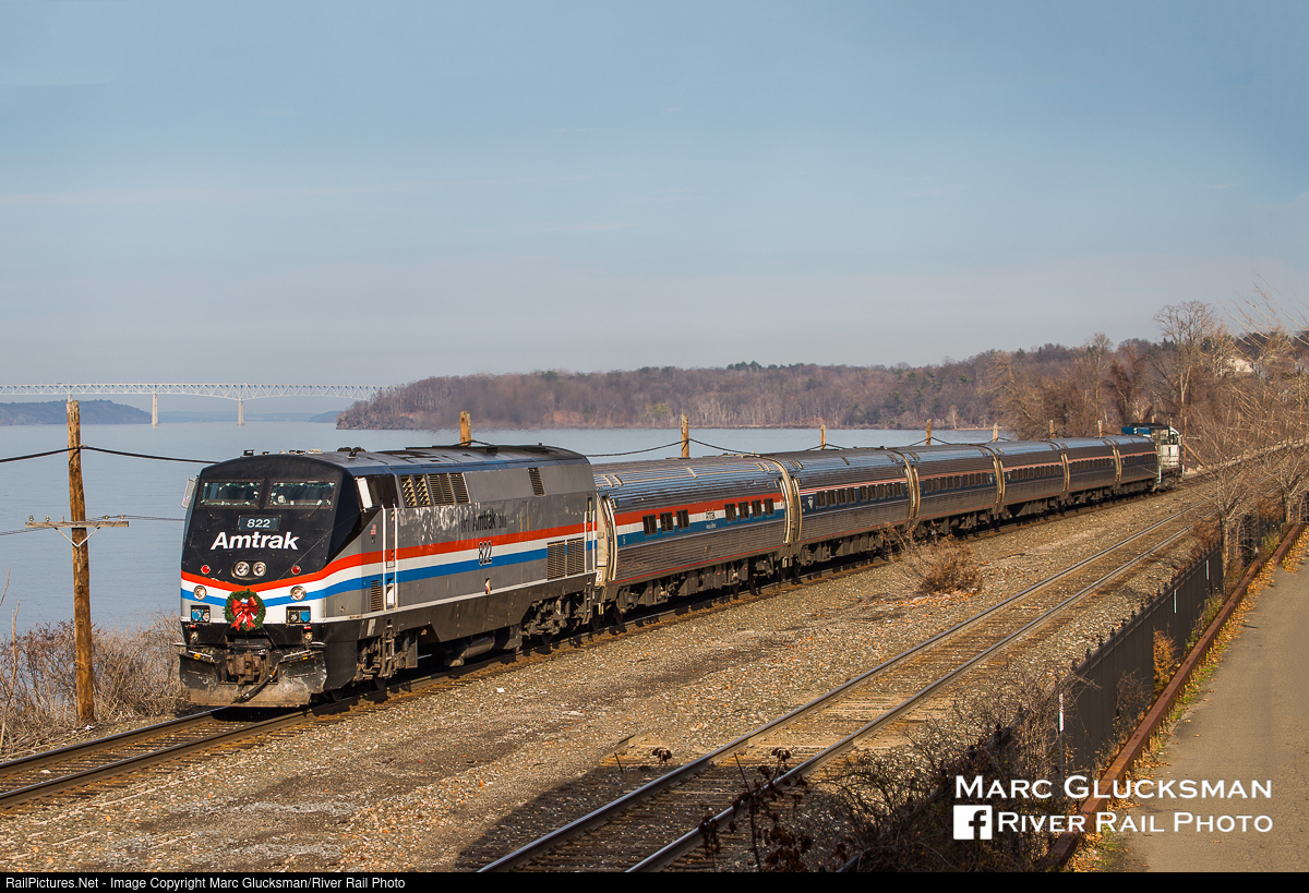 Holiday Train. On Saturday, December 12, 2015, Amtrak 822 (P40DC, Phase III) lead the Employee Holiday Special between Albany-Rensselaer and Rhinecliff, New York. Behind the power, AmFleet I Cafe Car AMTK 85999 matches the Phase III striping. The train is seen pulling into the Amtrak Rhinecliff Station with the Kingston-Rhinecliff Bridge crossing the Hudson River in the background.