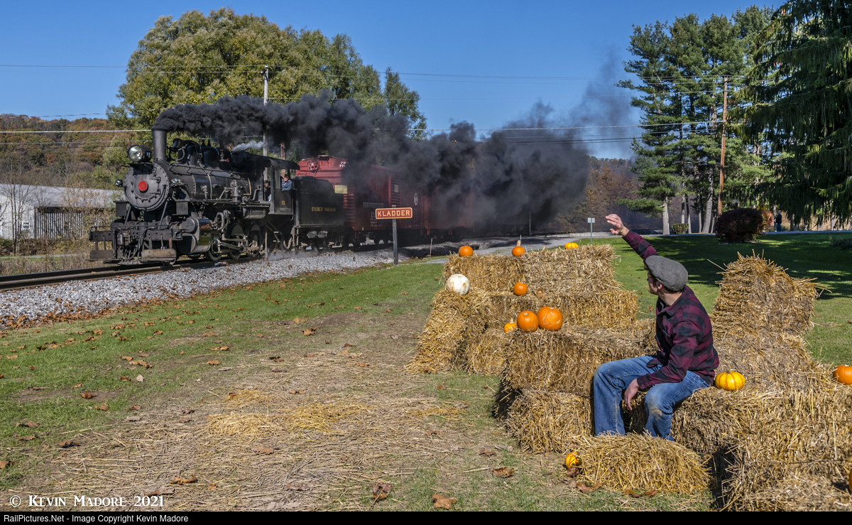 Passing Kladder Station. A farm hand taking a break from his chores gives a friendly wave to the crew of an Everett Railroad Locomotive #11 as they haul their mixed train through Kladder Station (MP 12), about a mile east of the town of Newry, PA. Although there is no station building or depot at this location, the Everett Railroad often uses it as a destination for themed excursion trains, such as the "Pumpkin Patch" trains offered in the fall.