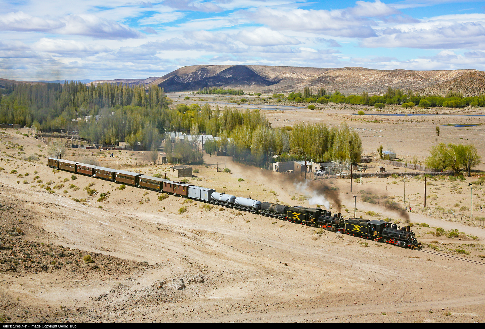 A doubleheaded steamtrain, with 2-8-2 "Baldwins" # 1 and # 16 of 1922, is leaving Cerro Mesa, about 130 kilometer from Ingeniero Jacobacci, on the 402 kilometer long 75 cm (2 ft 5+1?2 in) narrow gauge "Trochita" ("Old Patagonian Express"). This was a Trains Unlimted Tours (TUT) charter which travelled the entire line during 3 days.