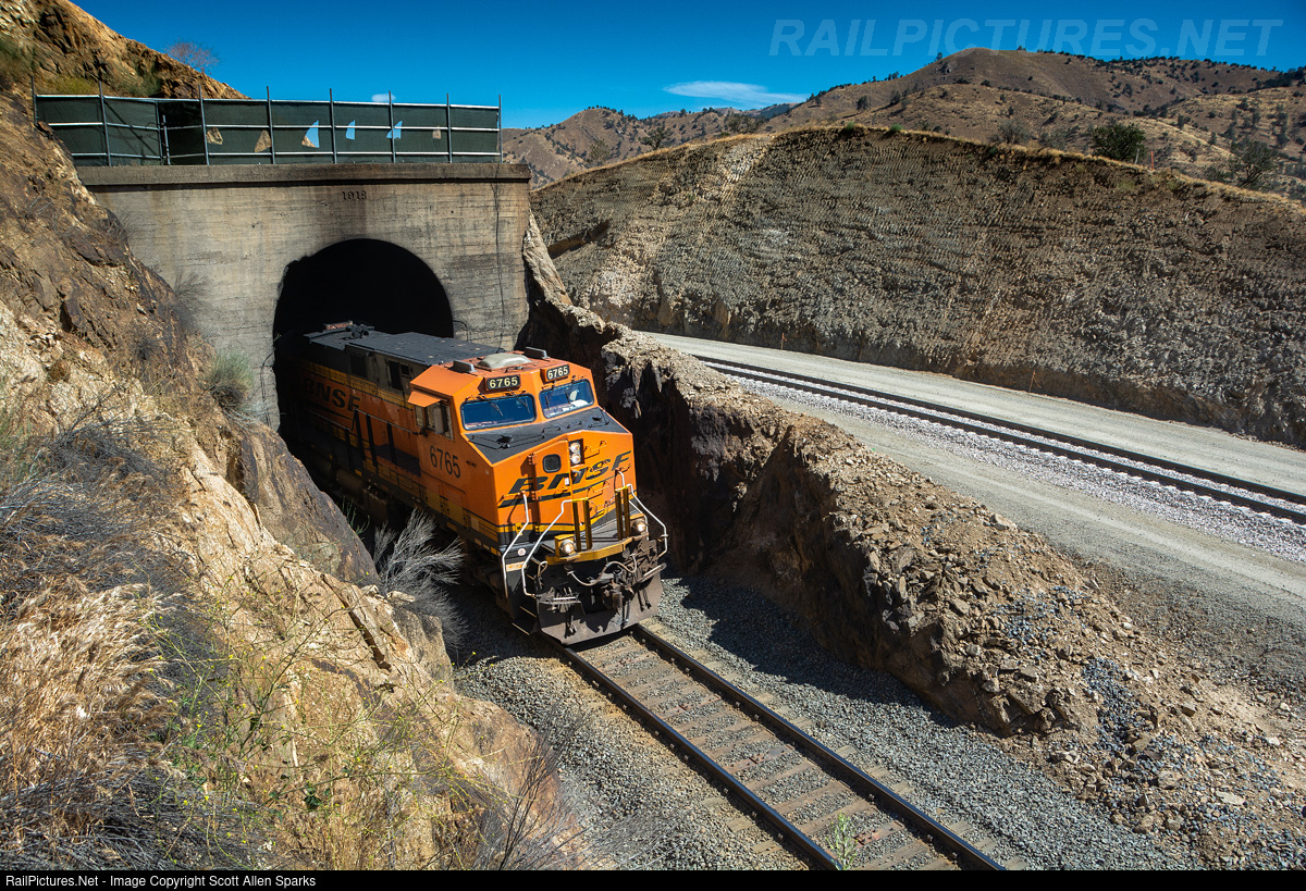 | Slowly poking out of tunnel 10 and into the summer morning sun is BNSF 6765 and her extremely long south bound stack train that requires 2 more locomotives right behind 6765 and an additional 2 on the rear end pushing, as the train navigates it’s way through the Tehachapi Loop area on another warm day in the Tehachapi Mountains.