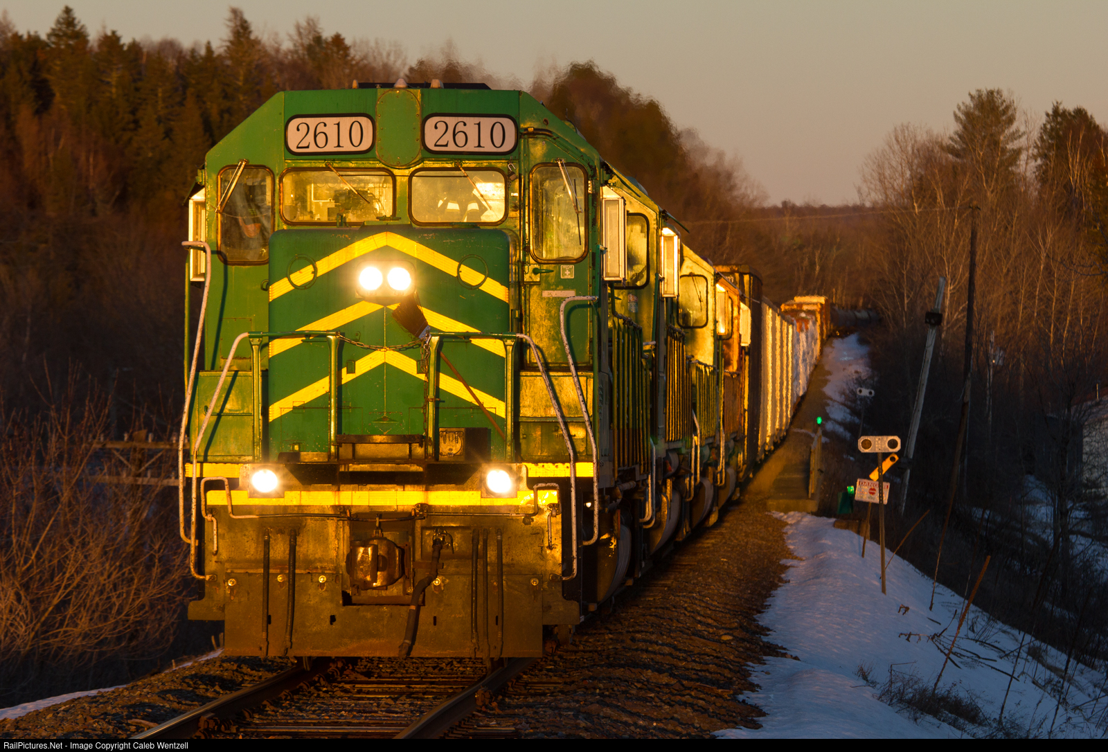 | NBSR 2610 leads the charge on 907 across the St. Croix River bridging the gap between St. Croix, NB and Vanceboro, ME in the final light of this cold January day. A fresh American crew has just swapped with the Canadian crew at McAdam and will now prepare to go through customs, located directly behind me. |
