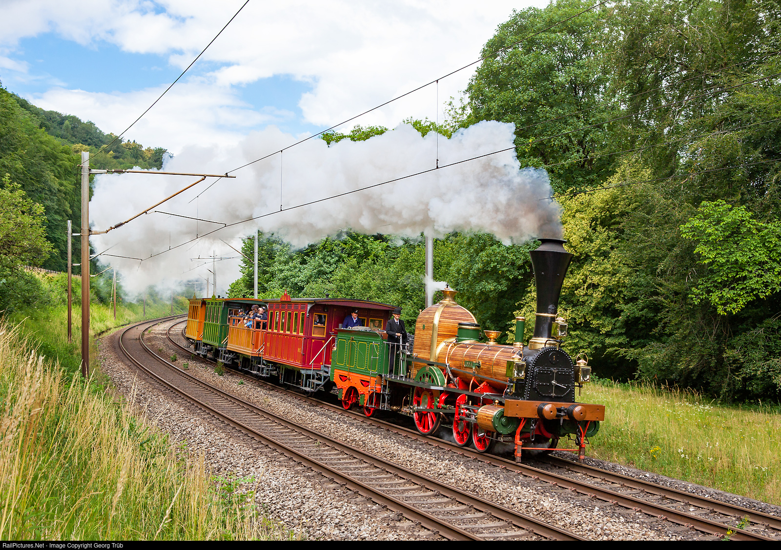 | 4-2-0 steamlocomotive D 1/3 # 1 "Limmat" with the "Spanisch-Brötli-Bahn" cars on the 1.2 % grade from Turgi to Baden on the occasion of the "Depotfest Bahnpark Brugg" (event steam shed Brugg). Steamlocomotive and cars are replicas from 1947 of the original ones from 1847. Locomotive and cars have no air brake nor usual couplers and buffers. In 2021, there were 175 years of railway in Switzerland and this train should run again in august, probably. |