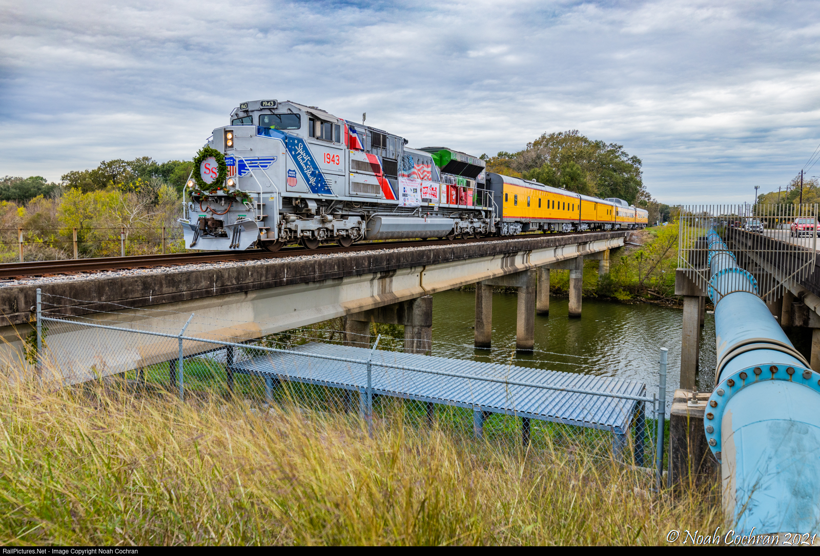 | Union Pacific's 2021 Toys for Tots excursion partnered with the UPVets' Houston/Gulf Coast Chapter and the U.S. Marine Corps heads south down UP's Galveston Subdivision in Houston, TX. The train originated in UP's Settegast Yard and is running the twenty miles south to the Ellington Field Joint Reserve with UP's special paint SD70AH No. 1943, Spirit of the Armed Forces, in the lead. |