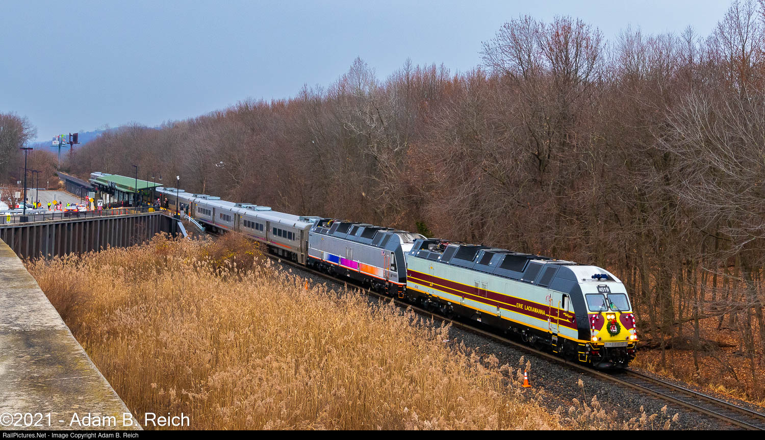 2021 Santa Train in Wayne: The 2021 edition of the Tri-State Railway Historical Society's Santa Train makes a triumphant return to the Wayne/Route 23 Transit Center after a one-year absence due to the COVID-19 pandemic. Adding to the excitement was the presence of NJ Transit's Erie Lackawanna Railroad Heritage ALP-45DP to lead the train on ex-Erie Lackawanna rails between Wayne and Denville. Note the wreath and candy cane decorations on the lead unit.