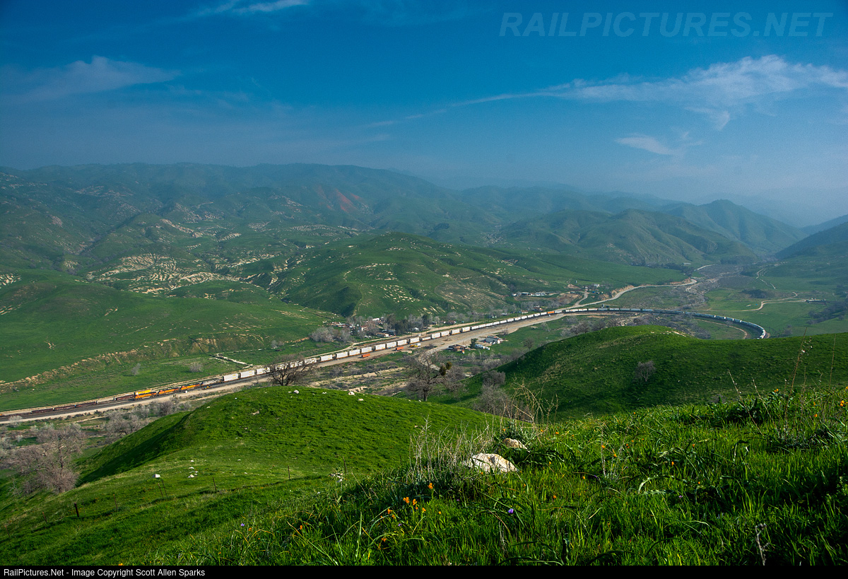 | Mid morning on a cool winter day in the lower Tehachapi’s brings the daily flow of morning north bounds down the mountain, through the majestic emerald foothills. Here, a BNSF intermodal glides down around the horseshoe curve and through Caliente and is approaching the eastern opening to the Caliente Canyon, only a few hundred yards away.