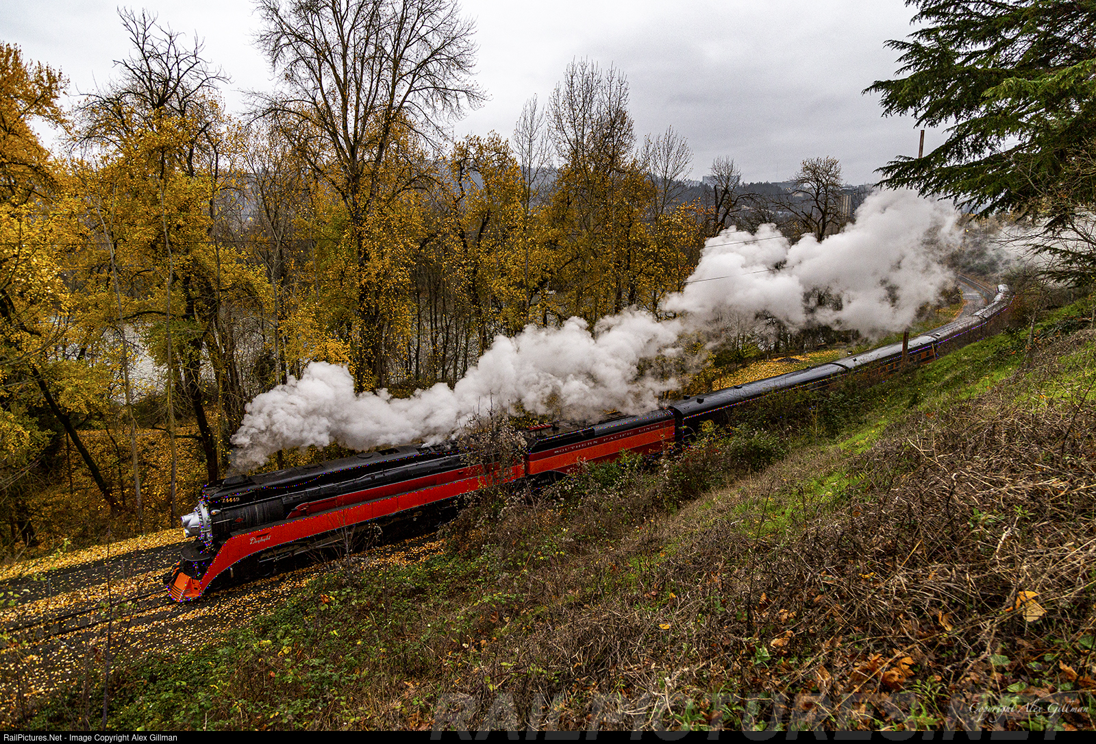 | With the change in direction beneath the Ross Island bridge complete just a few minutes ago, SP 4449 leads the Holiday Express back toward Oaks Park with another sold out train of happy families enjoyed hot chocolate, candy canes and a personal visit from Santa Claus himself. Outside on this brisk December afternoon, a line of stunning foliage almost makes it feel like fall with many yellow leaves still hanging onto the branches of these trees located on the banks of the Willamette River. |