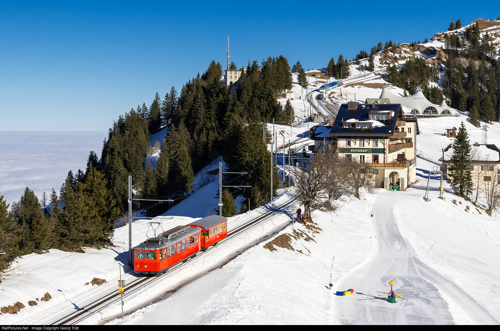 Cogwheel railcar Bhe 2/4 # 2 of the Rigi Bahnen, built in 1937, is shoving car B # 1, built in 1871 when the line was inaugurated 150 years ago, between Rigi Staffelhöhe and Rigi Staffel towards Rigi Kulm, running as relief train for CC 1127. In the background, above Staffel station, is the "Sport-Pendel" (push-pull train for sportsmen) visible with railcar BDhe 4/4 # 15, cab car Bt # 25 and open car B # 34, running between Rigi Klösterli and Rigi Kulm twice an hour.