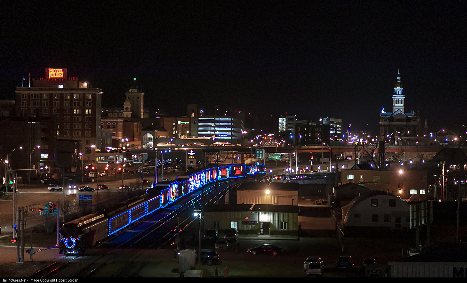 Canadian Pacific Holiday train passes downtown Dubuque, Iowa north bound toward Marquette, IA. The CN yard office is in the foreground and framed by landmark Julien Hotel and the Dubuque County Court House.