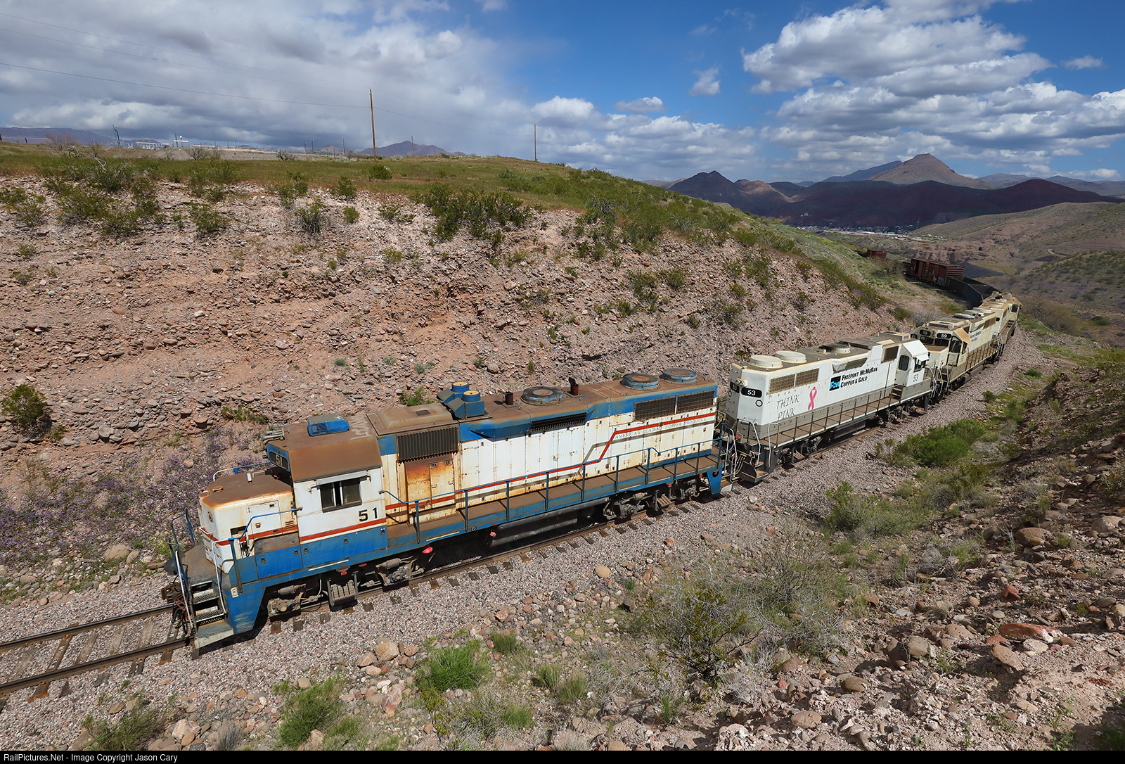 Former Phelps Dodge 51 built in 1967 screams up the 4-5% grade at Corral Cut. The locomotive has dust filters making for a very unique tribute to the past Phelps Dodge Fleet. The stairs and pilot are reinforced from when the Geep 38 once worked the Morenci Pit, and likely pushed its share of rocks off the rail.