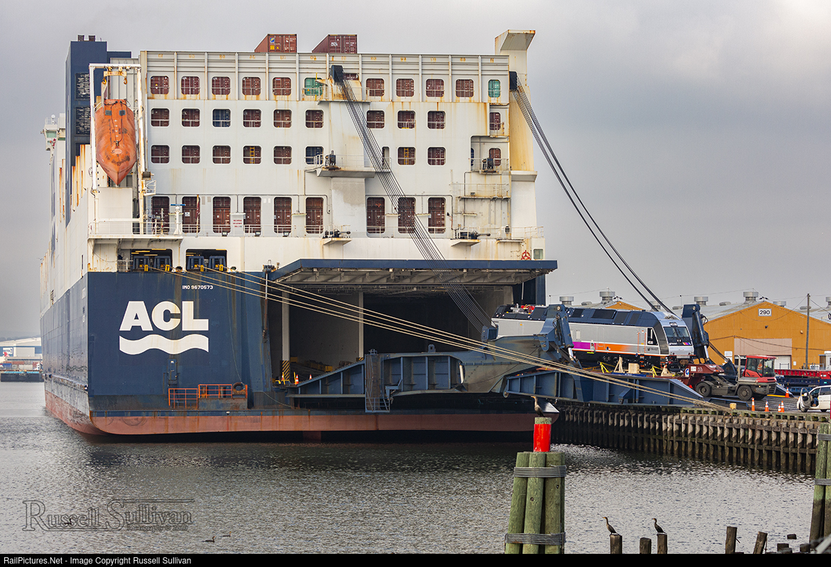 ALP-45A 4538 has just completed its month's long journey across the Atlantic Ocean from Kassel, Germany to Port Newark, NJ and is being wheeled off the Atlantic Star Ro/Ro ship on December 31, 2021 in preparation for being delivered to NJ Transit. The 4538 is one of 25 new Alstom/ Bombardier ALP45A locomotives purchased by NJ Transit, and is the third locomotive to arrive into the United States. Once transported off the ship, the locomotive will be lifted off the rubber-wheeled trailer and placed onto the US rail network, where Conrail Shared Assets will tow the unit to Kearny, NJ for interchange with NJ Transit. The new dual-mode locomotives meet EPA Tier IV emissions standards and are to replace older locomotives in the NJ Transit fleet.