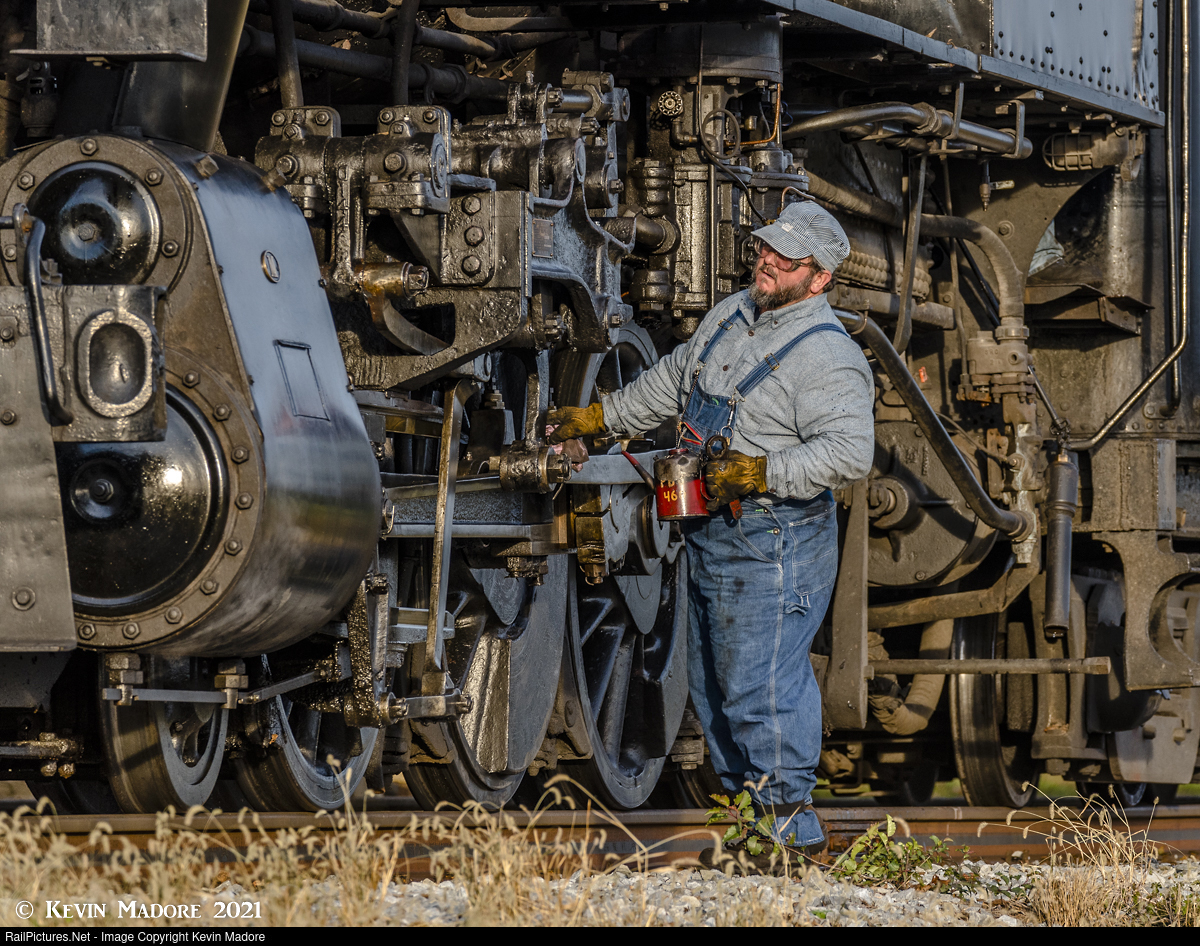 Babying the beast. As his chartered photo freight sits in the hole at Groff's Picnic Grove, awaiting the passage of the hourly passenger train, a Strasburg Rail Road Engineer takes advantage of the down time to top off the oil cups on the running gear of the former Norfolk & Western M-Class 12-Wheeler #475. Weighing in at over 200,000 lbs, and generating more than 40,000 lbs of tractive effort, this beast sits on 56" drivers and is one of the taller steam locomotives you'll find in tourist service in the US, along with her stablemate, the former Great Western Decapod #90.