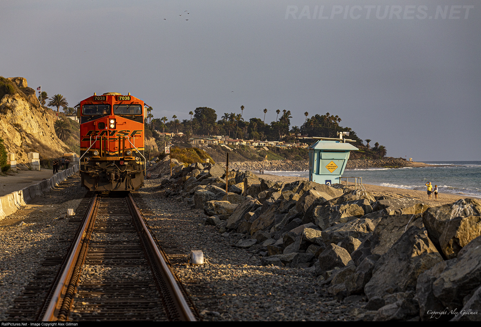 With its day of dumping riprap along the Surfline complete, today's work train has just taken on its new crew at Calafia Beach as the sun closes in on the horizon to bring another day to a close. While not entirely successful due to an unwanted quantity of dirt ending up in the loads that made dumping the cars difficult, today's train managed to dump more than 20 cars before the original crew began getting close to their hours of service. Riprap trains like this have been coming down the Surfline almost daily to dump between MP 207.6 and 207 in an effort to try and shore up the rocky defense between the pounding waves and tracks after this section of the line began to become geologically unstable. On top of passenger train service begin suspended for more than two weeks (tentatively scheduled to return October 3), freight service was also temporarily stopped. The severity of the situation extended to houses located just above the work zone as well as large cracks in backyards and homes were discovered, proving further that the earth was becoming unstable below ground level.