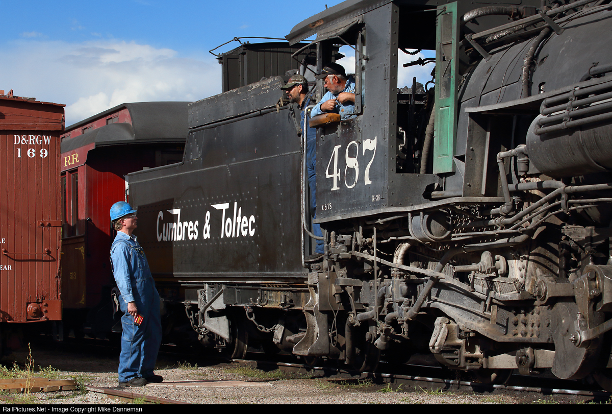Cumbres & Toltec Scenic Railroad’s daily passenger train has just arrived on the end of its run at Chama, New Mexico, on the afternoon of August 28, 2021. As passengers disembark, the engine crew strikes up a conversation with a carman. In a few minutes, the train will head for Chama’s wye to turn the train, and the carman will check for any defects as the cars roll by.