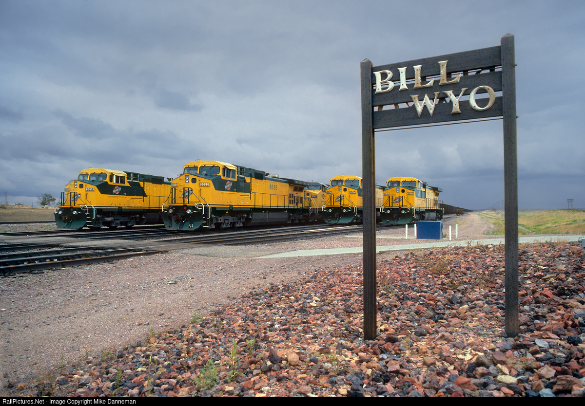 BILL WYO New General Electric C44-9Ws are lined up at Bill, Wyoming, ready to haul Chicago & North Western coal trains on the Orin Line in Powder River Basin on July 7, 1994. The unique Bill station sign stood in front of C&NW’s yard office at the tiny Wyoming burg.