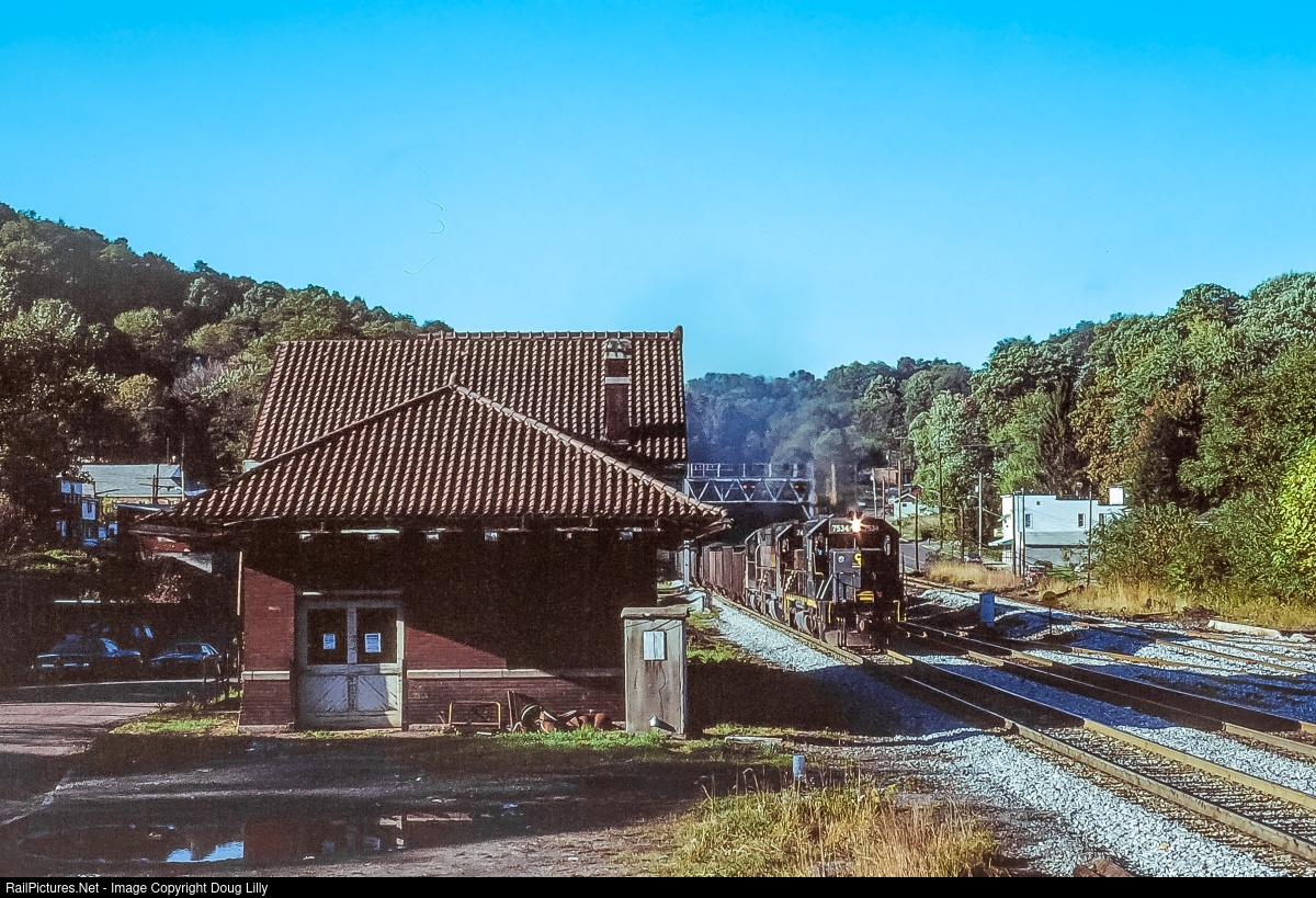 | A Chesapeake & Ohio SD40 leads an eastbound train of West Virginia coal past the depot at Tunnelton, West Virginia on Baltimore & Ohio’s St. Louis line. |