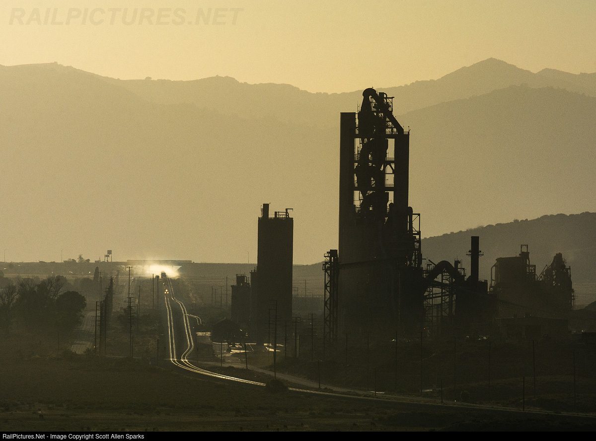 | Late afternoon summer sun back lights the summit area of Tehachapi as a south bound UP manifest crests the hill during a strong wind storm kicking up a cloud of dust around the sprinting train that is quickly approaching Monolith in the foreground.