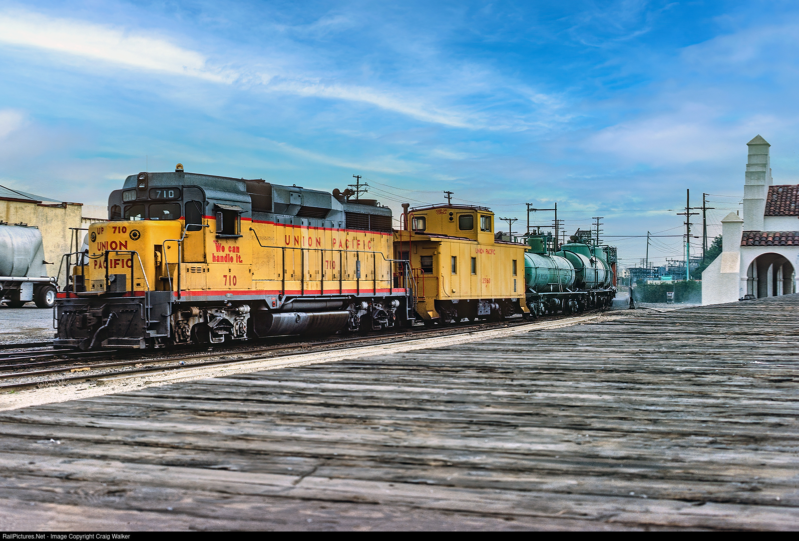 The Union Pacific's Anaheim Branch was in need of a little weed abatement, and the railroad sent a weed sprayer down to Anaheim and back to spray some weed killer along the right-of-way. The train, led by GP30 710, was passing the UP station in Fullerton, not long after leaving Anaheim. Today, the GP30 is gone, the caboose is gone, the station's freight platform is gone - even the tracks are gone. But that station? It is still in use, although it was moved across the UP tracks, across the Santa Fe tracks (parallel to the UP line, behind the warehouse with the grain trailer next to it) and across Harbor Boulevard (the bridge over which the train has already crossed) – and is now a very busy Old Spaghetti Factory restaurant in the Fullerton Amtrak station's parking lot. Click HERE to see a rear view of the train, including the weed sprayer car. (Fullerton, California – January 20, 1977)